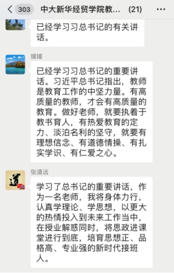 党委宣传部王宇阳:通过学习习近平总书记关于教育工作重要讲话精神,我深刻感受及学习到习近平总书记对于教育事业的冀望及要求,教育是国之大计、党之大计。作为一名年轻的教育工作者,我们任重道远。未来,我会向身边的各位党员先锋同志、老一辈教育工作者、领导同事们多多学习。要像习近平总书记说的那样,培养自己热爱教育的定力、要有淡泊名利的坚守,永远把师风师德摆在首要位置,做一个有理想信念、有道德情操、有扎实学识、仁爱之心的教育工作者。