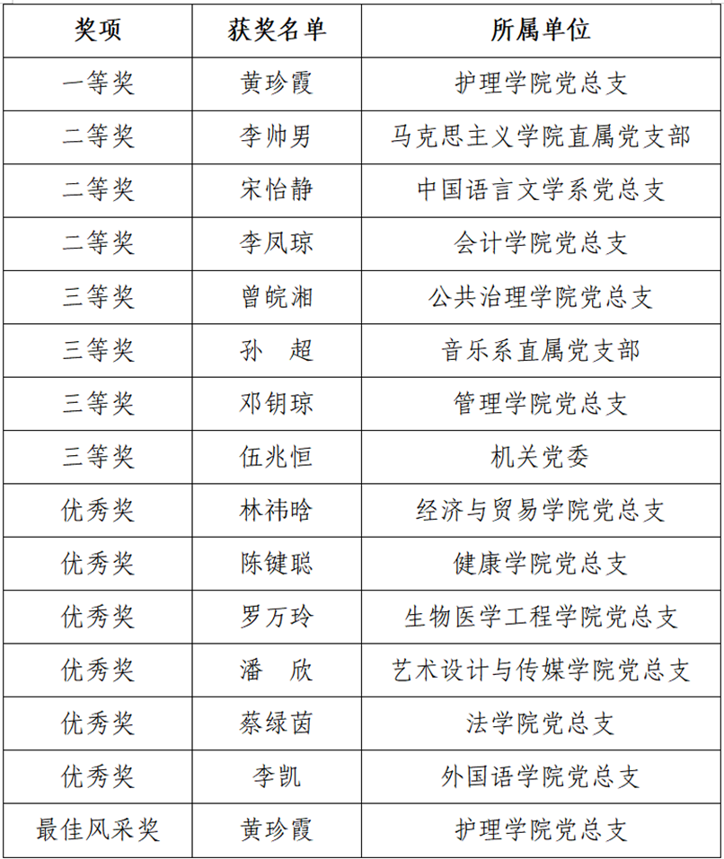 经过激烈角逐,黄珍霞老师荣获本次竞赛一等奖及“最佳风采奖”,李帅男等三位老师荣获二等奖,曾皖湘等四位老师荣获三等奖,林祎晗等六位老师荣获优秀奖。