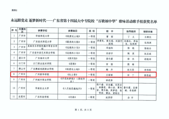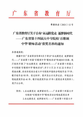 2021年5月21-22日,在广东省教育厅主办的“永远跟党走 逐梦新时代”——广东省第十四届大中专院校“百歌颂中华”歌咏活动中,我校王丽丽老师喜获歌手组一等奖,122cc太阳集成游戏合唱团获合唱组二等奖,杨建生、田丁、童秀萍、李琴获优秀指导教师,在全省民办本科高校中名列前茅。