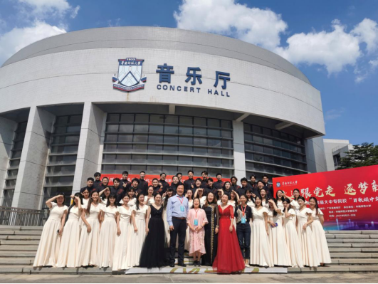 本次活动学校领导高度重视,由校团委牵头组织,音乐系提供专业支持,全校各院系同学们积极参与。活动决赛当天在广州大学城华南师范大学音乐厅举行,郑穗芬校长助理也莅临现场指导,并给与参赛师生慰问和鼓励。我校音乐系王丽丽老师演唱歌曲《红土香》,由郭思遥老师钢琴伴奏;音乐系和校团委共同组建的合唱团演唱《不忘初心》、《山丹丹开花红艳艳》,合唱由音乐系童秀萍老师指挥,张徵静老师钢琴伴奏,王丽丽老师领唱。