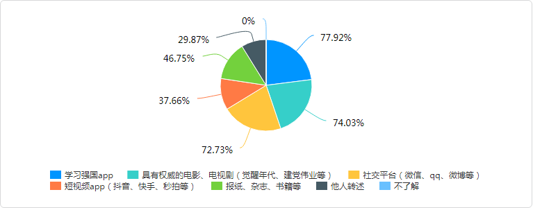 为此,我们“薪火相传”三下乡社会实践队通过问卷调查的形式对当代新青年对党史的了解程度展开了调查。根据调查结果显示,自2021年习近平总书记深刻阐述开展党史学习教育的重大意义和重点工作要求,作出对新时代学习党的历史、弘扬党的传统、开启新的征程、创造新的伟业重要部署以来,大学生学习党史的情绪高涨,与此同时,互联网的高速便捷也增加了大学生了解党史的途径,例如学习强国APP、红色革命电影等。