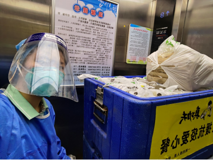 王欣老师推着满载的饭车,为学生送饭