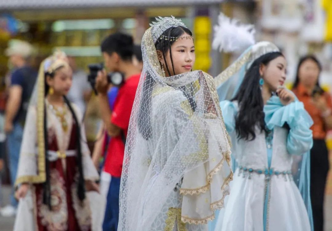 每日12时和18时,随着“咚咚咚”的鼓声响起,一场精彩的开街仪式正式开始。表演者们身着多民族服饰,展示着不同舞姿,游客纷纷拍照留念,场面热闹欢快。
