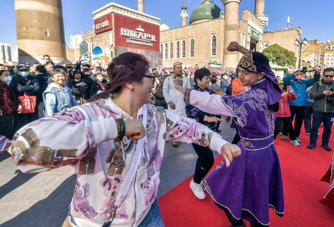 舞蹈演员与游客在大巴扎景区共同跳起舞蹈