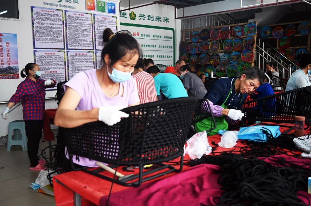 在广西三江侗族自治县南站社区,民众在就业基地制作藤椅,实现“家门口”就业。