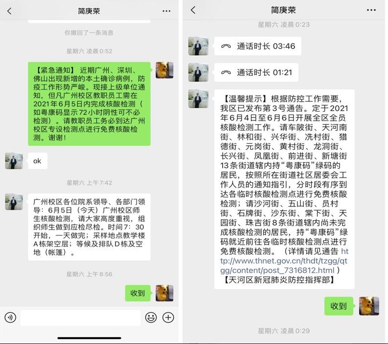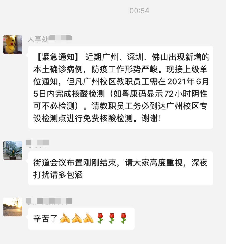 6月5日凌晨,人事处在我校教职工群内紧急通知广州校区教职工进行核酸检测